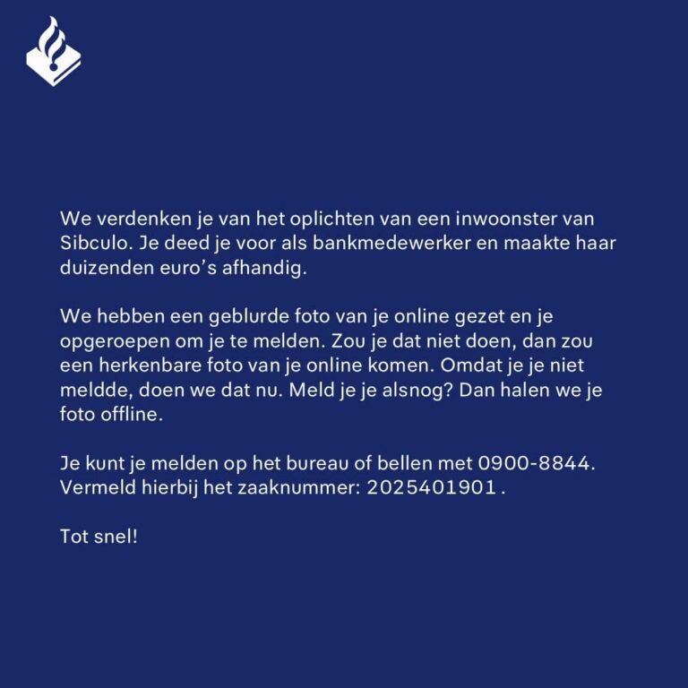 We spreken je graag. Kom langs op een politiebureau of bel 0900-8844. Vertel dat je je komt melden in verband met zaak 2025401901. We hopen je snel te zien!