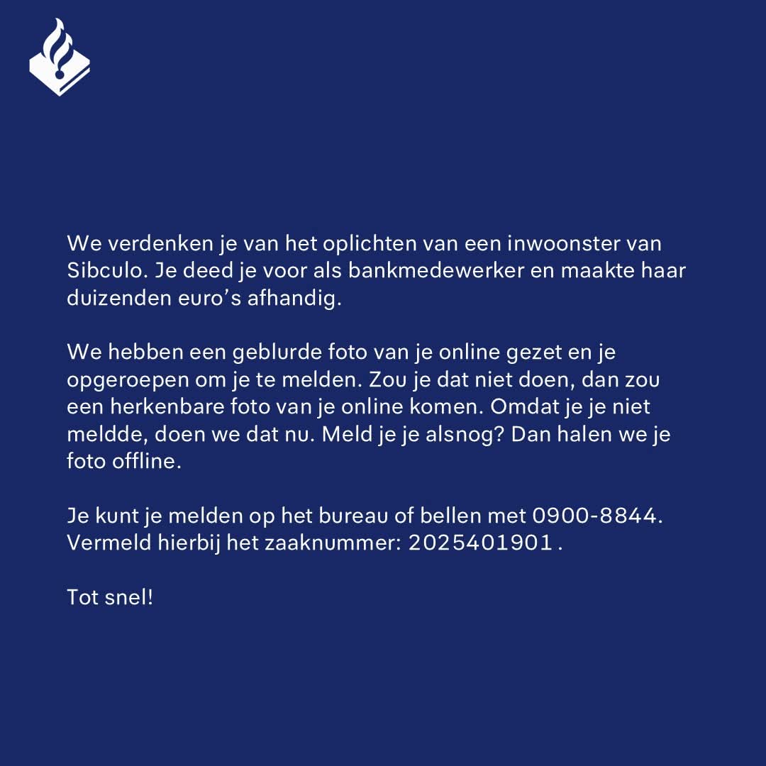 Aan de jongeman die zich op woensdag 13 augustus in Sibculo voordeed als bankmedewerker en duizenden euro’s van een oudere dame meenam,