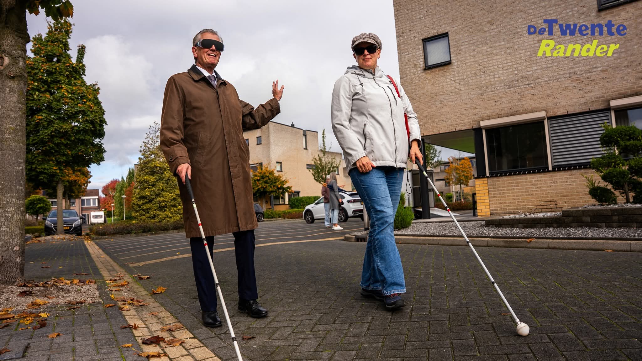 Met een witte stok in de hand en een simulatiebril ervaart hij hoe het is om als slechtziende door het verkeer te bewegen. Jeanet Kikkert laat hem voelen hoe afhankelijk je bent van geleide- en gidslijnen, geluiden en het gedrag van andere weggebruikers.