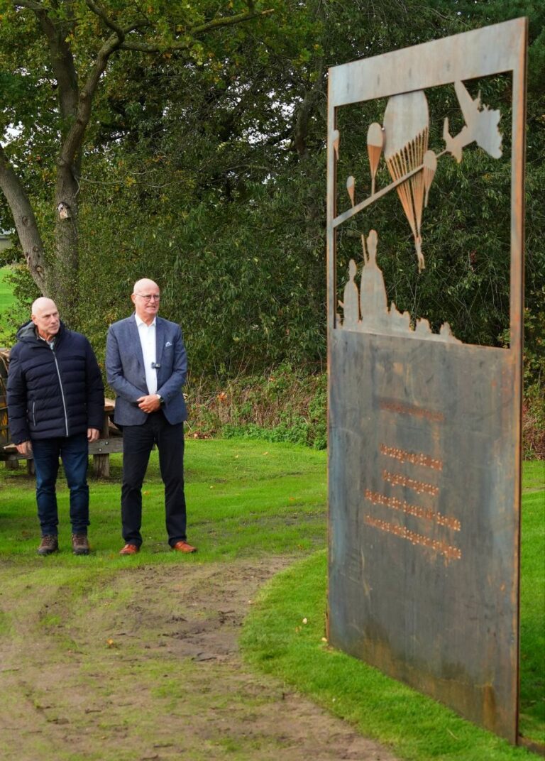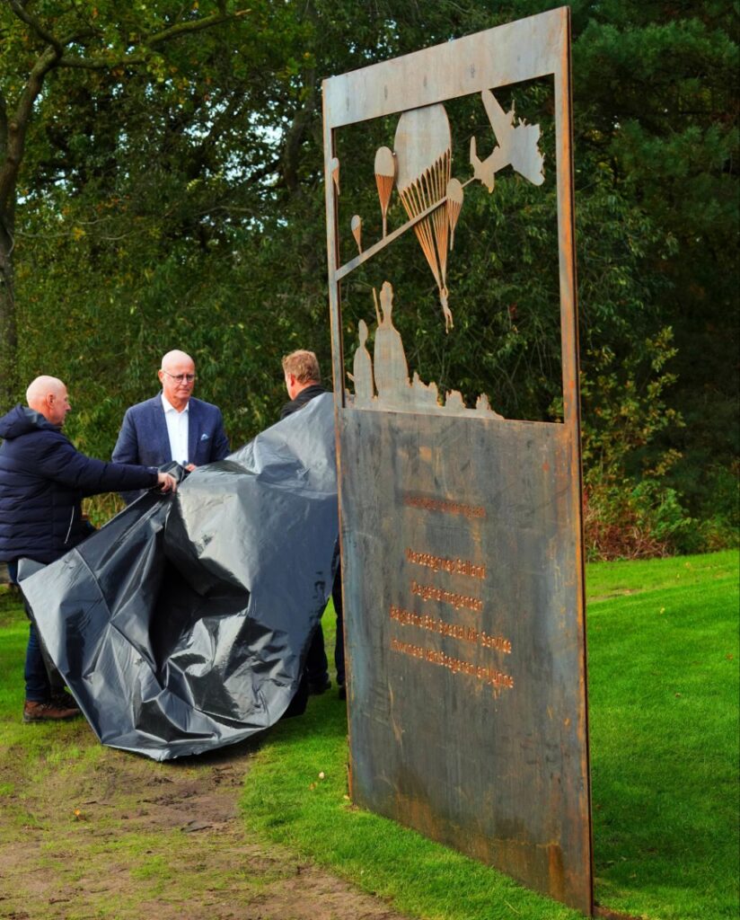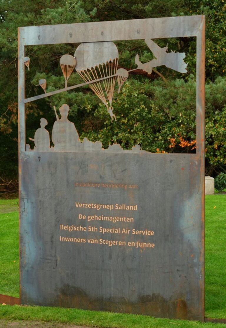 Er werd een indrukwekkend monument van cortenstaal zichtbaar, die veel bewondering en ook applaus oogstte. De kunstenaar Eric Schutte en Bas Bosscher gaven een toelichting op het uitdagende ontwerp. De omtrek van het verzetsmonument weerspiegelt een parachute op ware grootte. en bevat binnenin zitelementen. De beeltenis van vallende parachutes herinnert aan de pakweg 11 droppings met daarbij geheime agenten, wapens en proviand op het zo veilige dorppingsveld Evert waarbij de ‘vergeten soldaten van Oranje’ in actie kwamen. De tekst wordt in het staal zichtbaar: ‘In dankbare herinnering aan: Verzetsgroep Salland. De geheime agenten. Belgische 5the Special Air Service. Inwoners van Stegeren en Junne.’