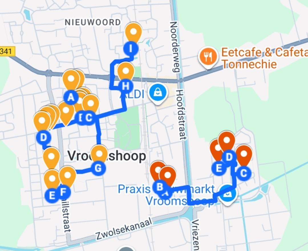 In de prinsenkamp begin je bij nummer 72 en loop je de eerst mogelijkheid naar links en dan rechtdoor als je daar recht door loopt loop tegen nummer 71 aan dan loop je richting de hoofdstraat en dan sla je rechts af richting de puntbrug via de puntbrug loop naar de Europasingel je loopt door totdat je links af kan naar de helmkruid vanaf daar loop je recht door richting de kamille daar sla je rechts af naar de vingerhoedskruid en mag je aanbellen bij nummer 15 vanaf daar loop je terug naar de kamillie je loopt daar recht door met de weg mee totdat je links kan zodra je links bent gegaan ga je ook rechts richting de watermunt daar mag je bij nummer 18 aanbellen daarna loop je weer terug richting de kruidenlaan onderweg kom je langs 24 en daar mag je aanbellen en dan loop je door je loopt recht door tot hoefblad daar ga je in en mag je bij nummer 34 aan bellen