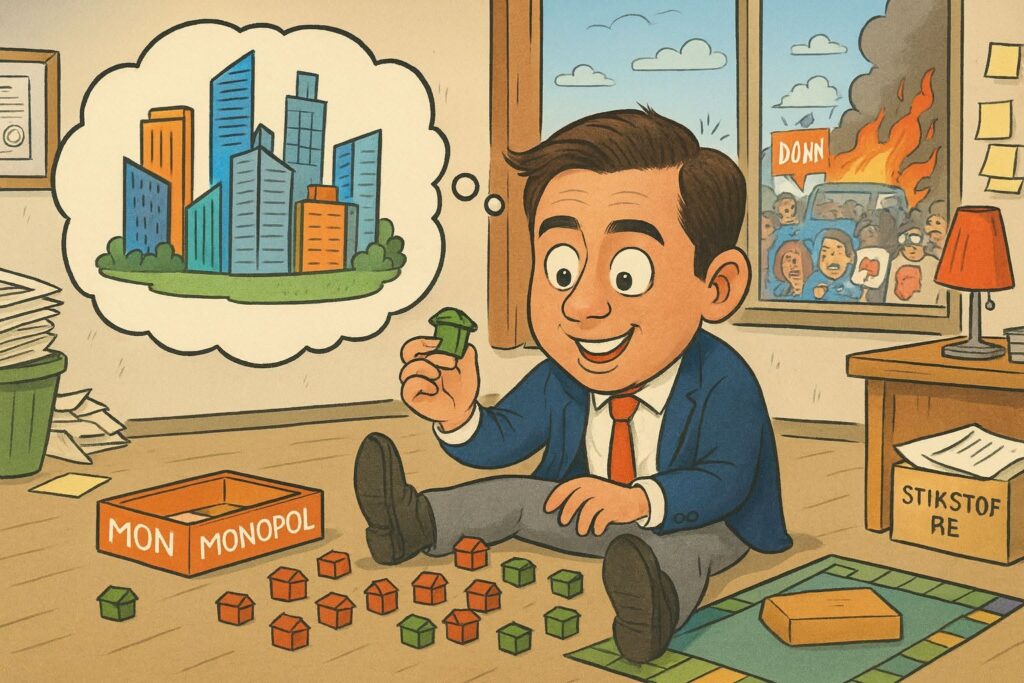 En toen kwam Robbie met het volgende punt: Tien nieuwe steden! Alsof hij een cheatcode heeft gevonden in SimCity. “Level tien bereikt! Unlock: Lelystad 2.0.” Alleen jammer dat zijn steden vastlopen op zijn eigen stikstofregels.