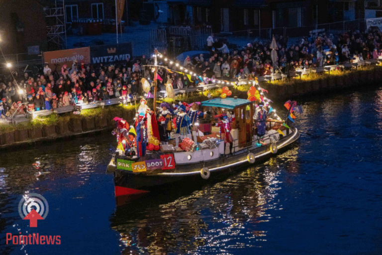 Langs het kanaal stonden honderden enthousiaste kinderen met smart te wachten op de prachtig verlichte boot waarmee Sinterklaas zou aankomen. Toen de boot eindelijk aanmeerde en Sinterklaas voet aan wal zette, barstte het publiek los in gezang en gejuich.