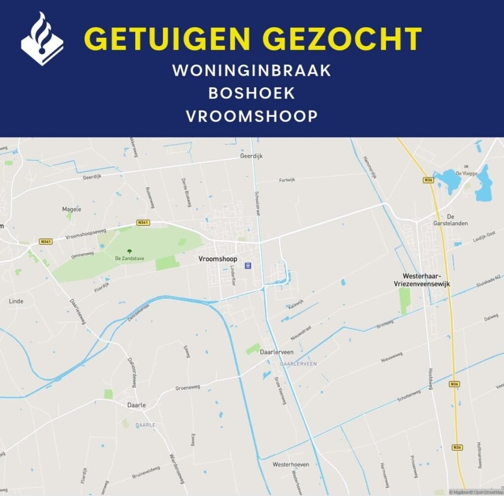 Aan de Boshoek in Vroomshoop vond op woensdag 26 november tussen 15:00 en 19:00 uur een woninginbraak plaats. De inbrekers kwamen binnen via de achterzijde van de woning. Heb je iets gezien of heb je camerabeelden beschikbaar? Tip ons via de website of bel naar 0900-8844. Zaaknummer: PL0600-2025573995