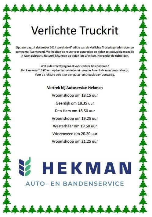 TWENTERAND – Het wordt opnieuw een kleurrijk spektakel: aanstaande zaterdag 13 december rijden de verlichte vrachtwagens weer door de gemeente Twenterand.