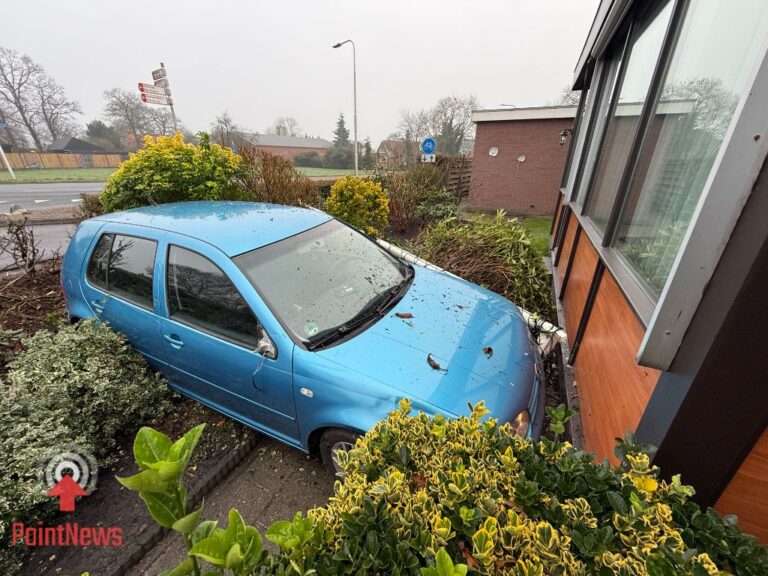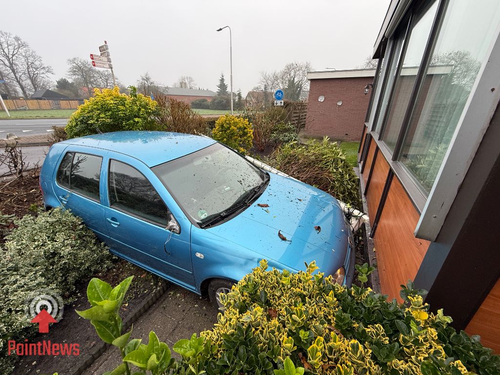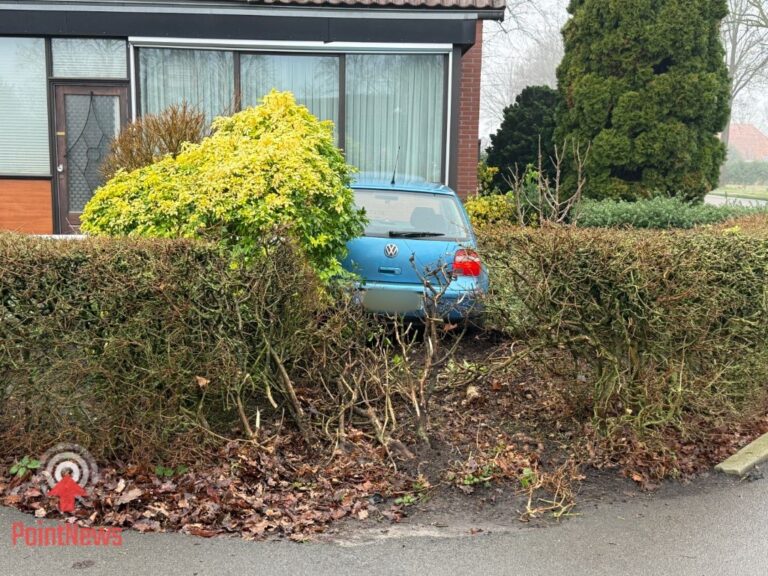 Bij het ongeval werd onder meer een vlaggenmast geraakt en ontstond aanzienlijke schade aan de auto en de tuin. De bestuurder, een jongeman, bleef ongedeerd, al was de schrik groot.