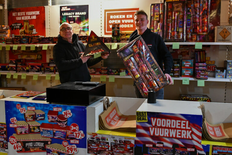 Ook bij Hengelsport Snippe aan de Hoofdweg in Westerhaar is de verkoop begonnen. Het is er al direct druk en diverse vuurwerkpakketten vinden gretig aftrek bij het publiek.