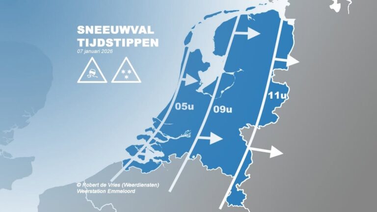 Een gebied met sneeuw trekt vandaag van west naar oost over het land. Wegen, fietspaden en stoepen worden glad. Door de combinatie van sneeuw en vrij krachtige wind is het zicht plaatselijk slecht zijn.