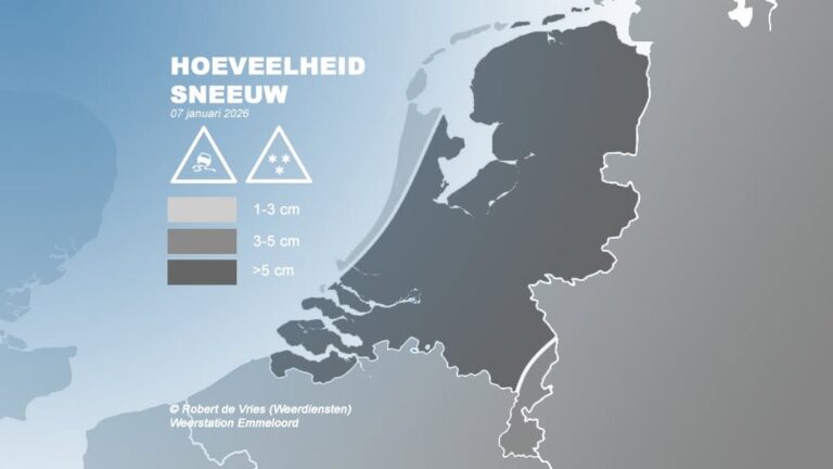 In de kuststrook blijft er naar verwachting 1-3 cm sneeuw liggen. Verder landinwaarts verwachten we 5-10 cm. Op de (oostelijke) Wadden verwachten we 2-5 cm.