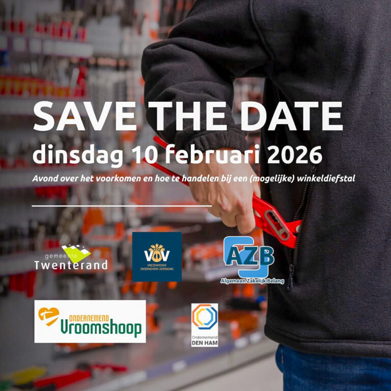 Noteer dinsdag 10 februari 2026 alvast in uw agenda! De vier winkeliersverenigingen (VOV, Ondernemend Den Ham, AZB Westerhaar en Ondernemend Vroomshoop) organiseren samen met de Gemeente Twenterand en Platform Veilig Ondernemen een