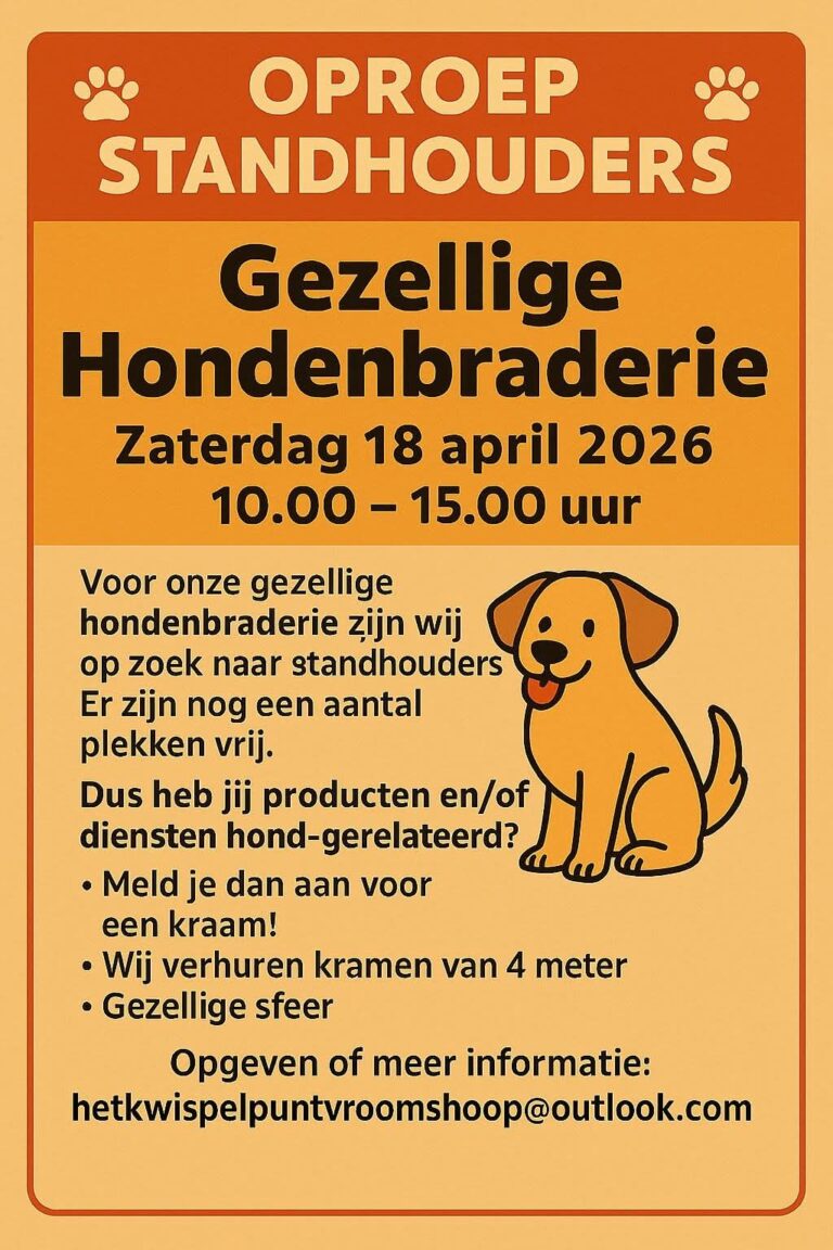 Zaterdag 18 april 2026! In Vroomshoop een gezellige honden braderie van 10:00 tot 15:00 uur!