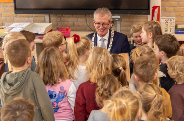 Burgemeester Gerrit Jan Gorter bracht deze week een bezoek aan de kleuters van de Shalomschool in Vriezenveen. Met het prentenboek Kleine Aap van Mies van Hout nam hij de kinderen mee in een vrolijk en herkenbaar verhaal. De klas luisterde met grote ogen, stelde scherpe vragen en genoot zichtbaar van het voorleesmoment. Ook de ambtsketen van de burgemeester trok nieuwsgierige blikken, maar het draaide vooral om het plezier van samen lezen.