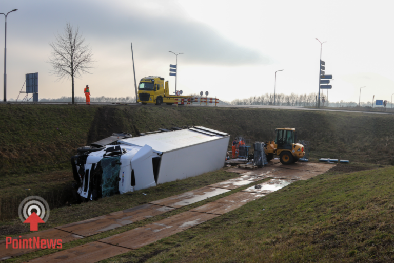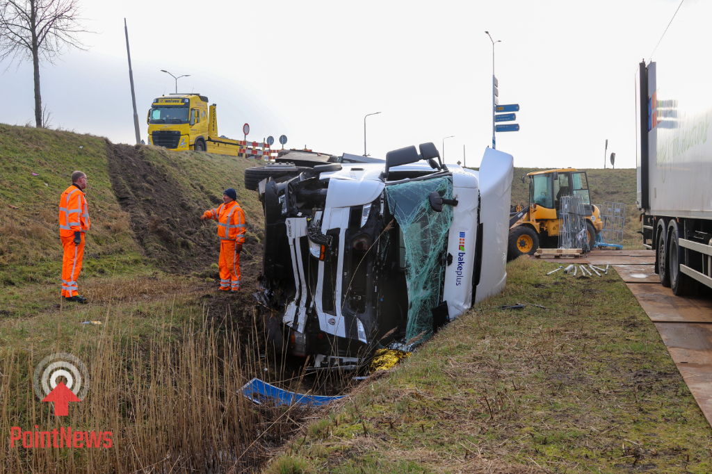 Door de aanrijding raakte de vrachtwagen van de weg, botste tegen een verkeerspaal en kwam via het talud op zijn zijkant terecht in een greppel. De chauffeur van de vrachtwagen raakte hierbij gewond.
