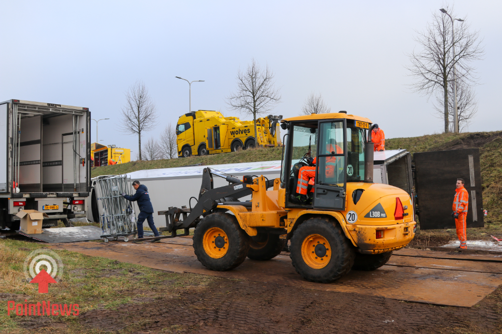 Bergingsbedrijf Wolves zal de vrachtwagen bergen met behulp van een grote kraan. Hoe lang de bergingswerkzaamheden gaan duren is op dit moment nog niet bekend.