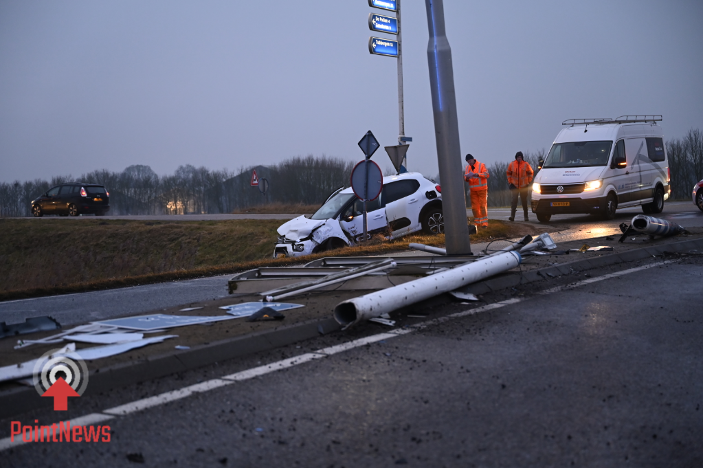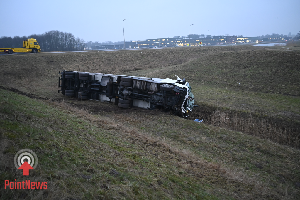 Door de klap raakte de vrachtwagen van de weg, botste tegen een grote verkeerspaal en reed vervolgens van het talud af, waarna het voertuig op de zijkant tot stilstand kwam. De personenauto raakte eveneens van de weg.
