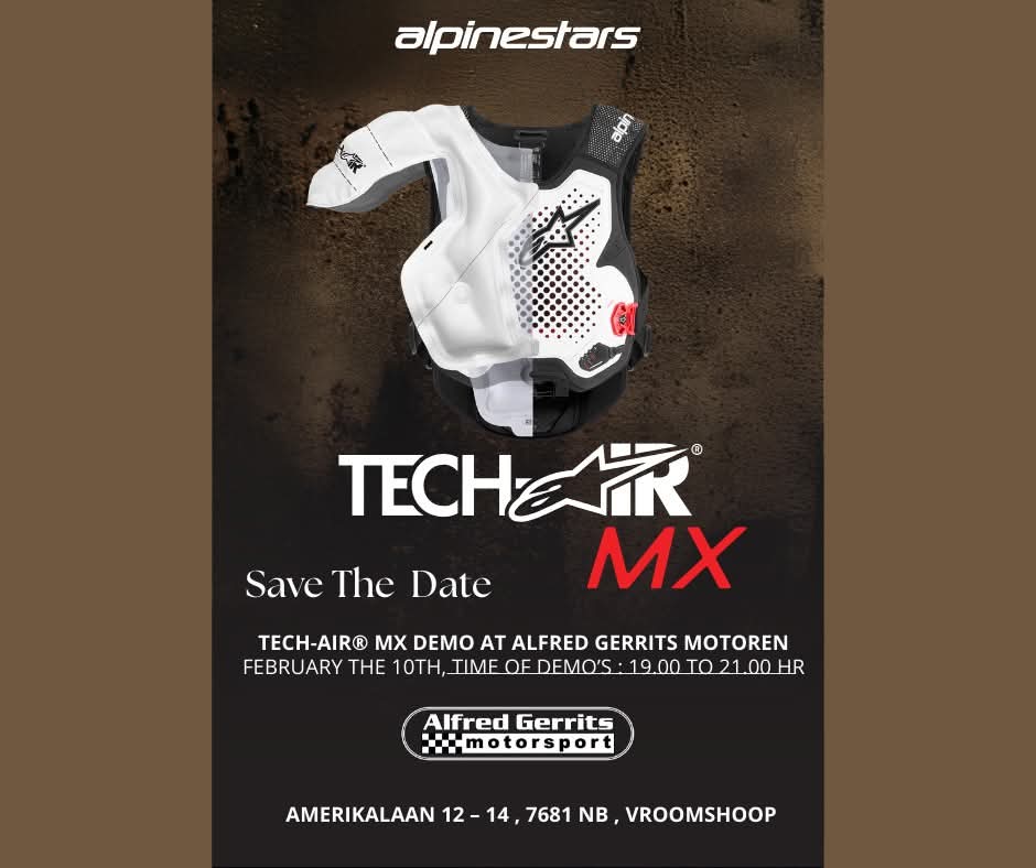 Kom op 10 februari langs bij Alfred Gerrits Motorsport aan de Amerikalaan in Vroomshoop en ontdek de Tech-Air MX van Alpinestars. Je bent van harte welkom tussen 19:00 en 21:00 uur, onder het genot van een hapje en een drankje.