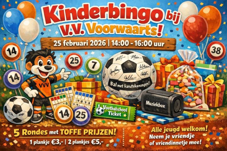 Woensdag 25 februari 2026 is het feest in de kantine van V.V. Voorwaarts! Van 14:00 tot ongeveer 16:00 uur organiseren we een supergezellige kinderbingo voor alle jeugdleden.