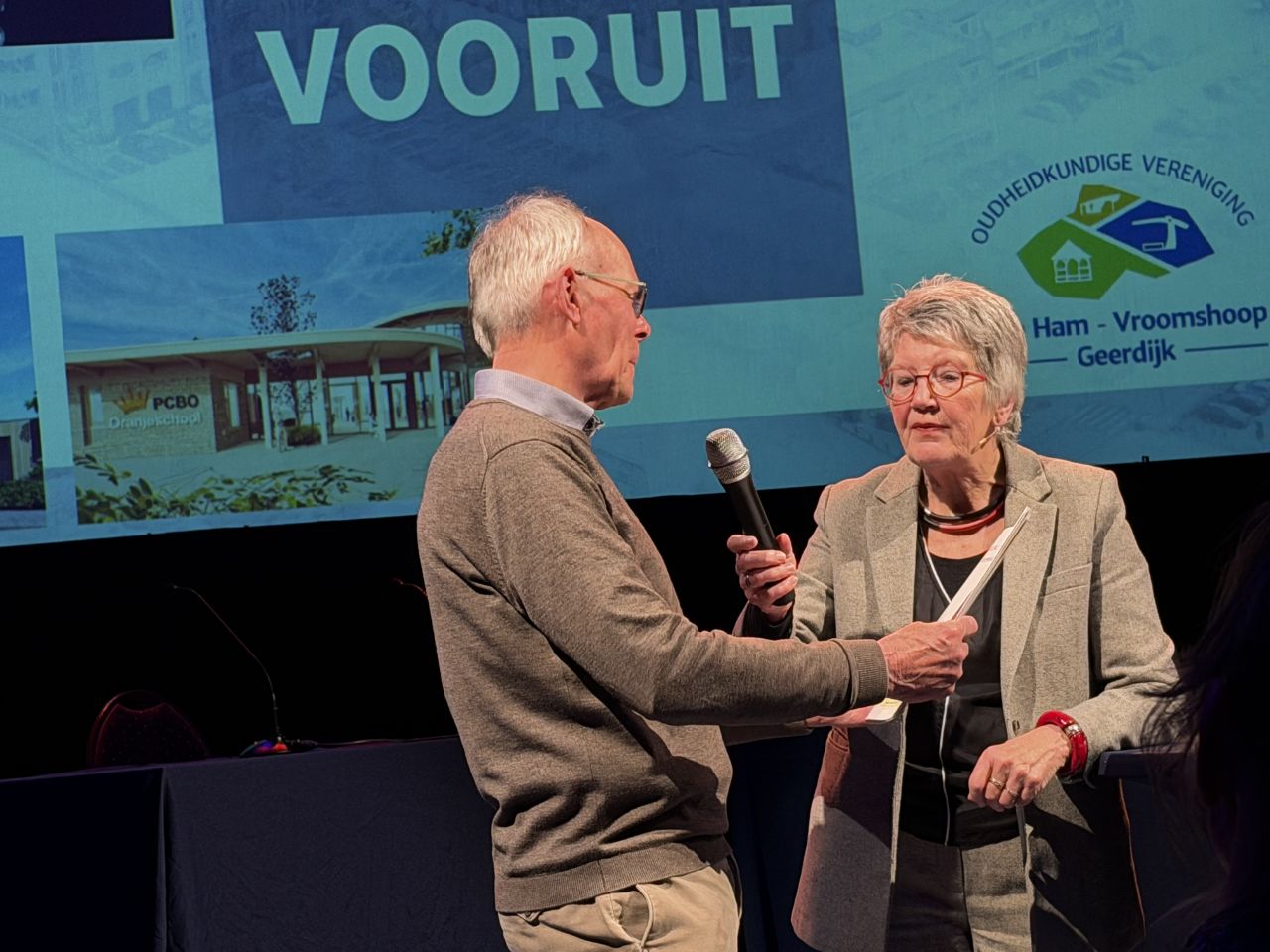 Oud-burgemeester Hans van Overbeeke had zijn bevindingen uit die bewogen periode nog altijd bewaard en wilde hier iets mee doen. De oudheidkundige vereniging Den Ham-Vroomshoop en Geerdijk vond dit een goed idee en zo zag de brochure ‘Sociale Vernieuwing in Vroomshoop’ het levenslicht. In de theaterzaal van het Punt in Vroomshoop werd op woensdag 18 februari door auteur Hans van Overbeeke het eerste exemplaar uitgereikt aan Gerlo Teunis, voorzitter van de lokale historische vereniging. Van Overbeeke sprak zijn dank uit voor de facilitaire en stimulerende rol van Gerlo Teunis c.s., die ook deze speciale avond over dit thema hadden georganiseerd.