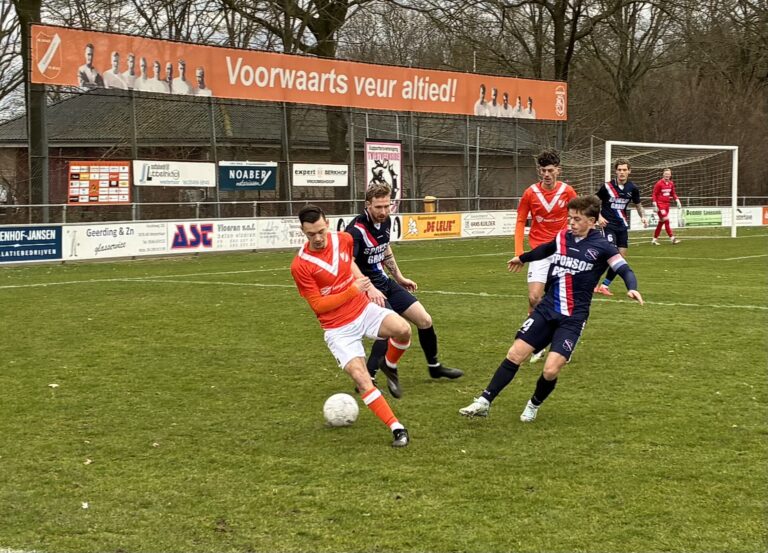 Toch zien we na ruim 25 minuten spelen Bruchterveld uit het niets op voorsprong komen, als er tijdens een cornerbal een speler van Bruchterveld op de grond valt en de scheidsrechter een penalty geeft. Duwen en trekken in het 16-metergebied, waarbij een speler op de grond valt, dat moet wel een heel erg grove overtreding zijn geweest, anders zijn er wekelijks enkele strafschoppen te vergeven….maar goed, dat zal de oranje-bril zijn van de verslaggever.