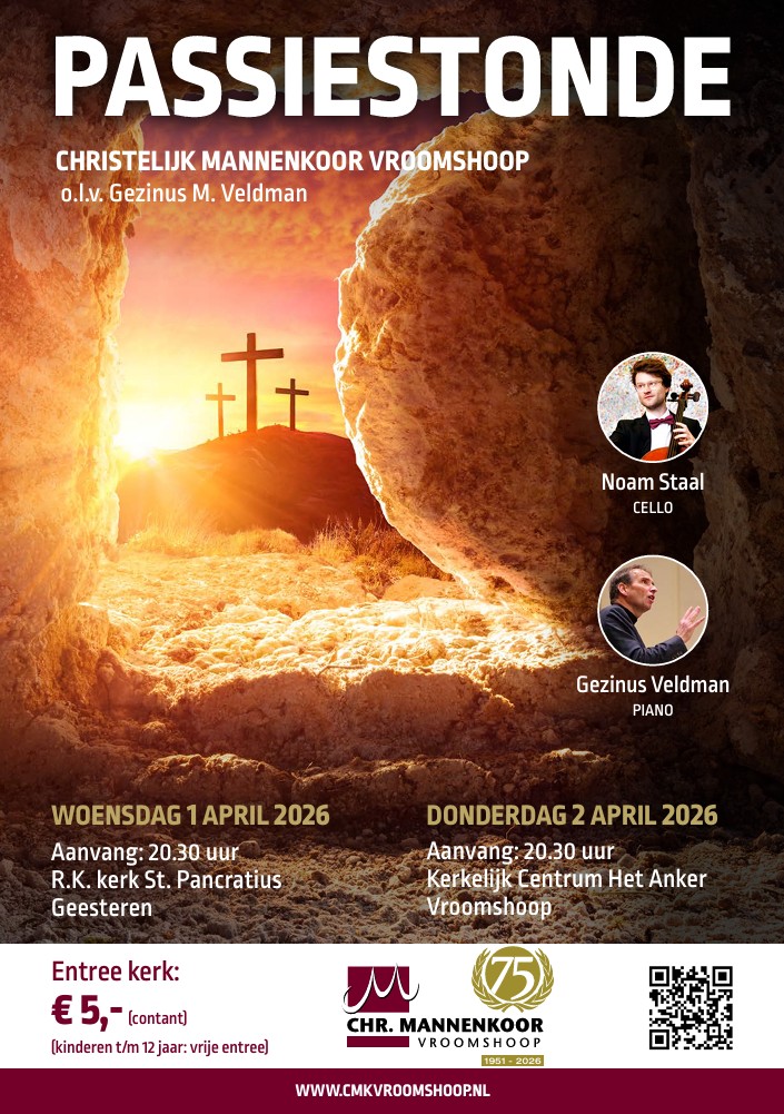 Het Christelijk Mannenkoor Vroomshoop houdt in 2026 weer twee Passiestonden. Ook dit jaar waarin het koor zijn 75-jarig bestaan viert, vindt deze rijke traditie weer plaats, en wel voor de 12e keer in Geesteren en voor de 27e keer in Vroomshoop.