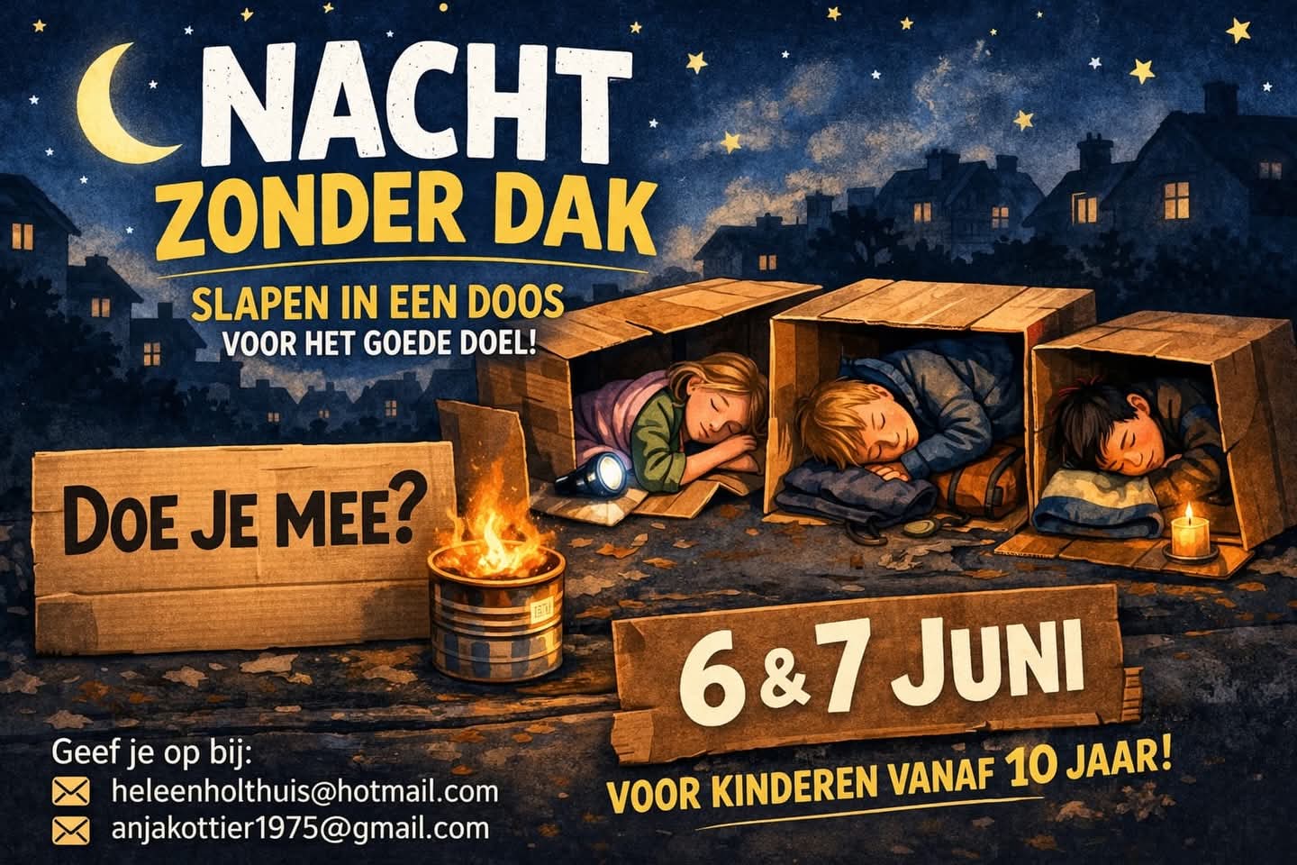 Stel je voor: het is avond. Je ligt niet in je eigen bed, maar buiten. Geen dak boven je hoofd. Alleen een slaapzak, misschien een stuk karton, en de sterren boven je. Dat is precies wat we gaan doen tijdens Nacht zonder Dak!
