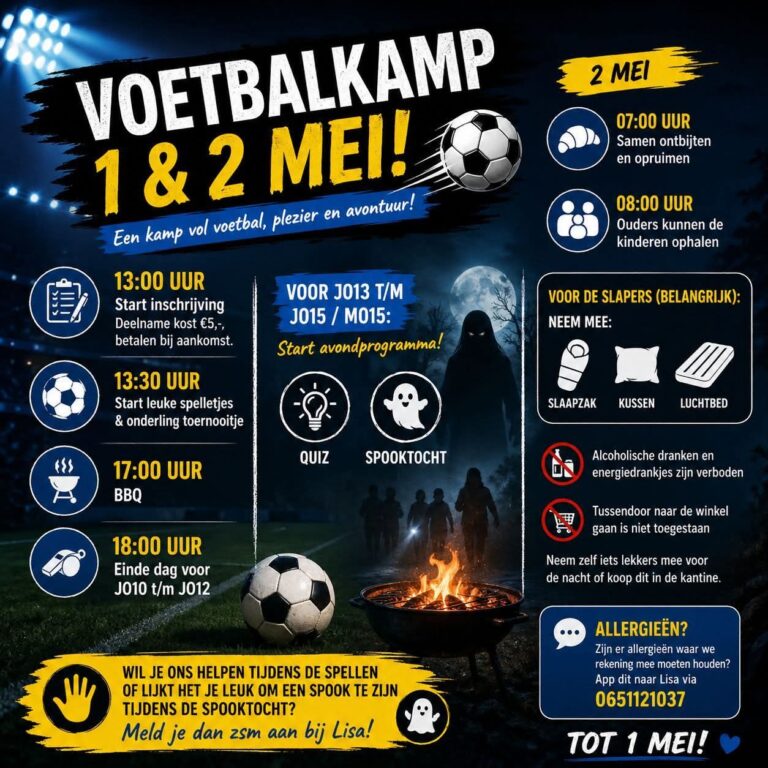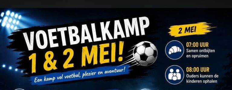 Het aftellen is begonnen! Op 1 en 2 mei organiseren we een gezellig en actief voetbalkamp voor onze jeugdteams. Er staat een gevarieerd programma klaar vol sport, plezier en leuke activiteiten.