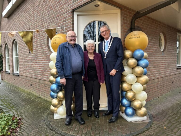 Burgemeester Gerrit Jan Gorter feliciteerde afgelopen week het echtpaar Nats (89) en Willy Berghuis (87) uit Westerhaar met hun 65-jarig huwelijk. Het stel is al