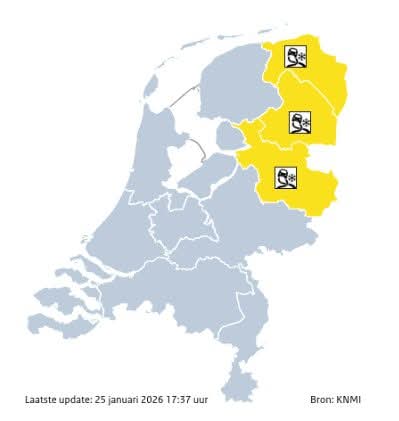 Maandagochtend kan het in het noordoosten licht gaan sneeuwen waardoor het plaatselijk glad wordt. Mogelijk wordt de sneeuw in de late nacht of vroege ochtend